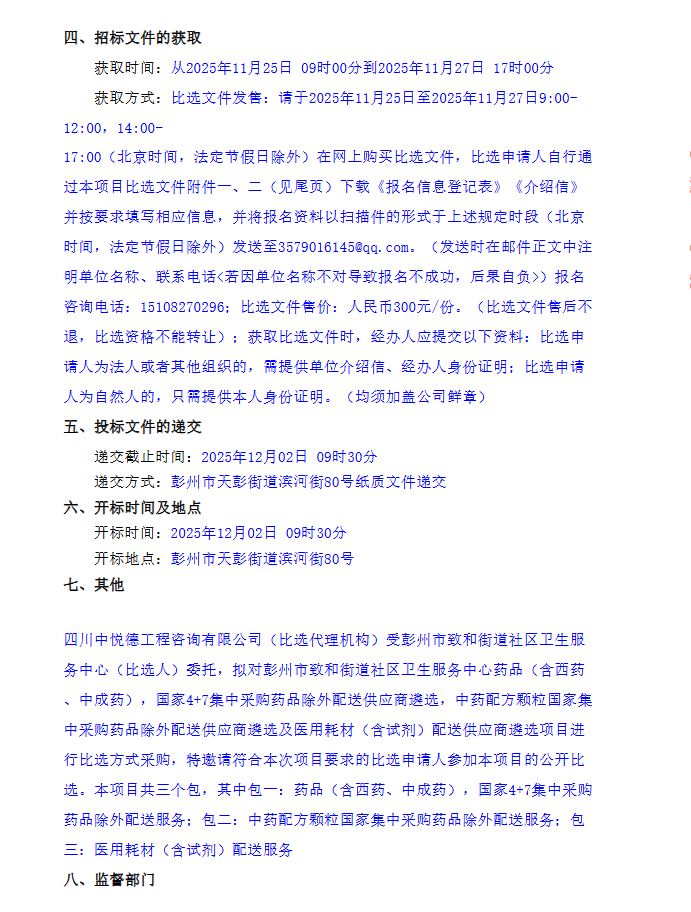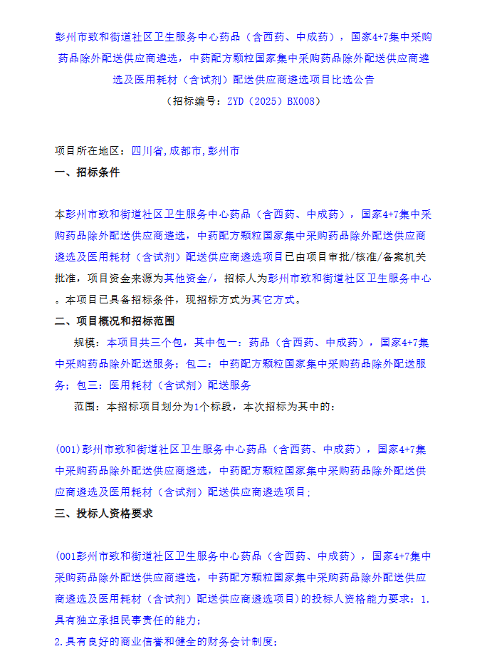 【成都市彭州市致和街道社区卫生服务中心】四川省彭州市致和街道社区卫生服务中心药品(含西药、中成药),国家4+7集中采购药品除外配送供应商遴选,中药配方颗粒国家集中采购药品除外配送供应商遴选及医用耗材(含试剂)配送供应商遴选项目比选公告