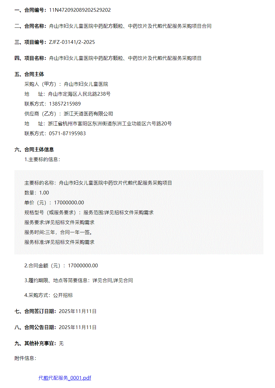 【舟山市妇女儿童医院】浙江省舟山市妇女儿童医院中药配方颗粒、中药饮片及代煎代配服务采购项目合同公告1