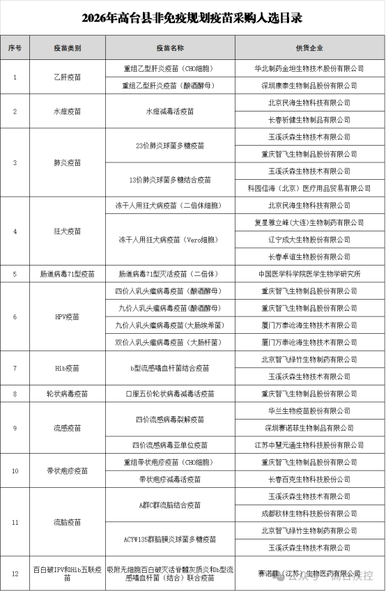 本次遴选共涉及12类21种疫苗,涵盖了流感、肺炎、HPV及带状疱疹等重点疫苗。详细目录见附件《2026年高台县非免疫规划疫苗采购入选目录》。