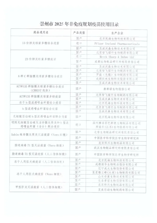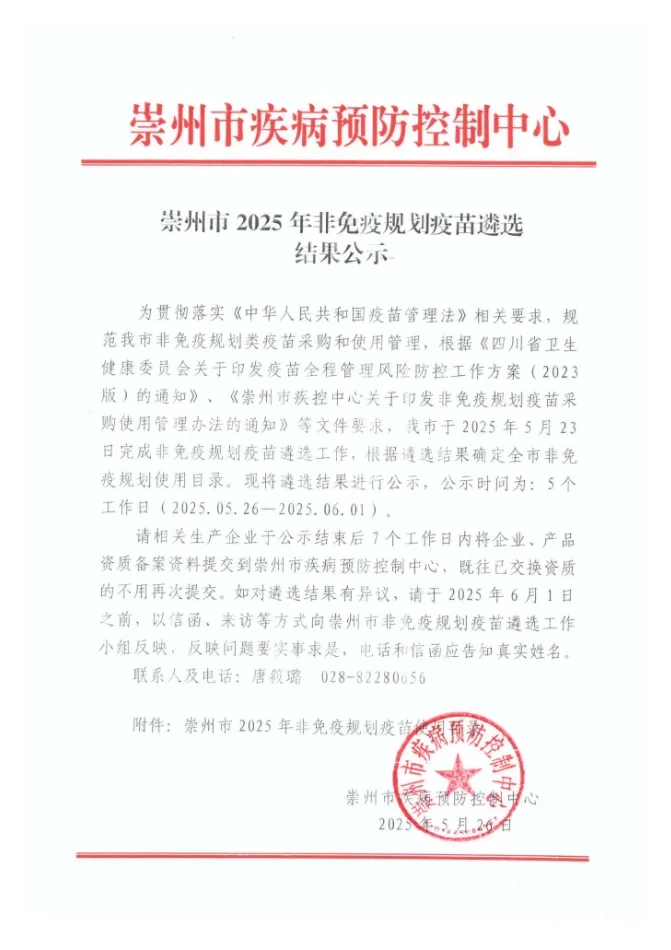 【成都】崇州市2025年非免疫规划疫苗遴选结果公示