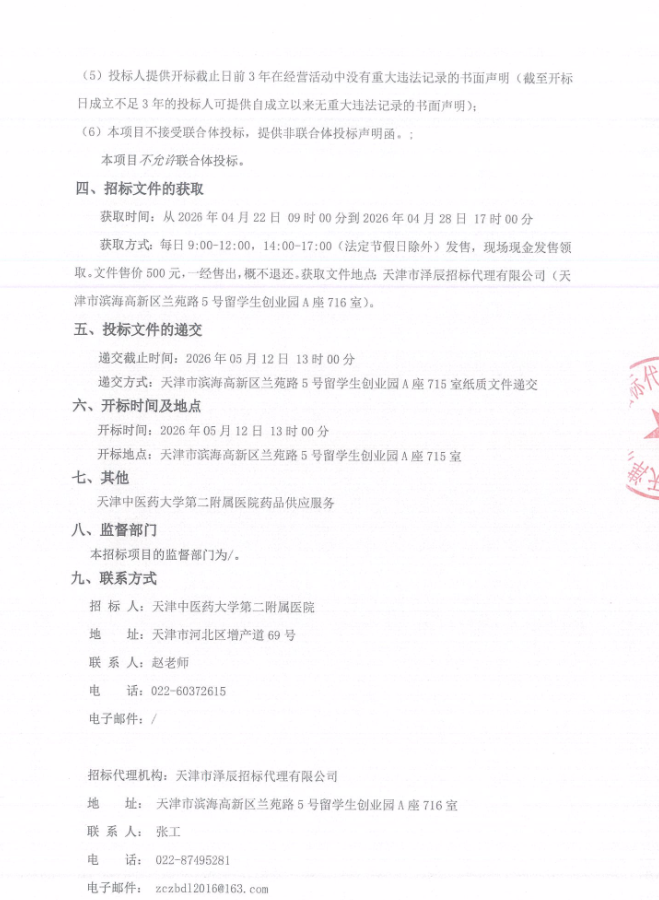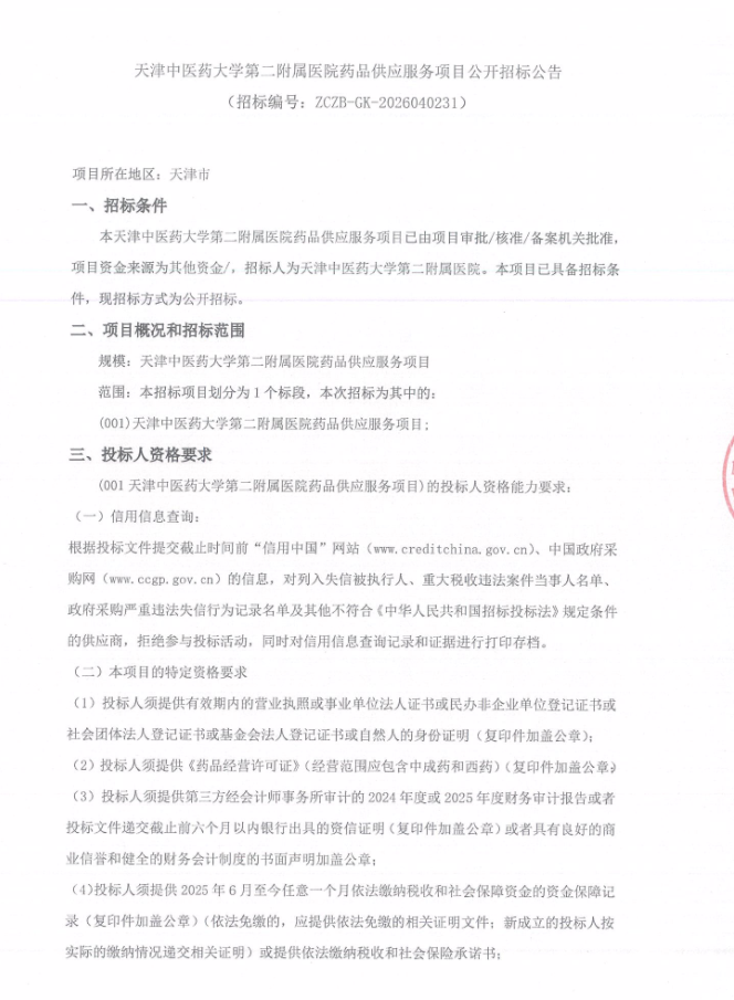 【天津中医药大学第二附属医院】天津中医药大学第二附属医院药品供应服务项目公开招标公告