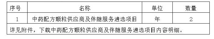 本次中药配方颗粒供应商及伴随服务遴选项目,为医院提供符合标准的中药配方颗粒及免费提供与医院规模相适应的中药配方颗粒智能调配所需系统、设备、环境供医院调剂使用,所提供设备、系统需满足医院中药配方颗粒调配需求,并定期进行系统更新、设备维护和保养、人员培训、技术支持咨询等服务。