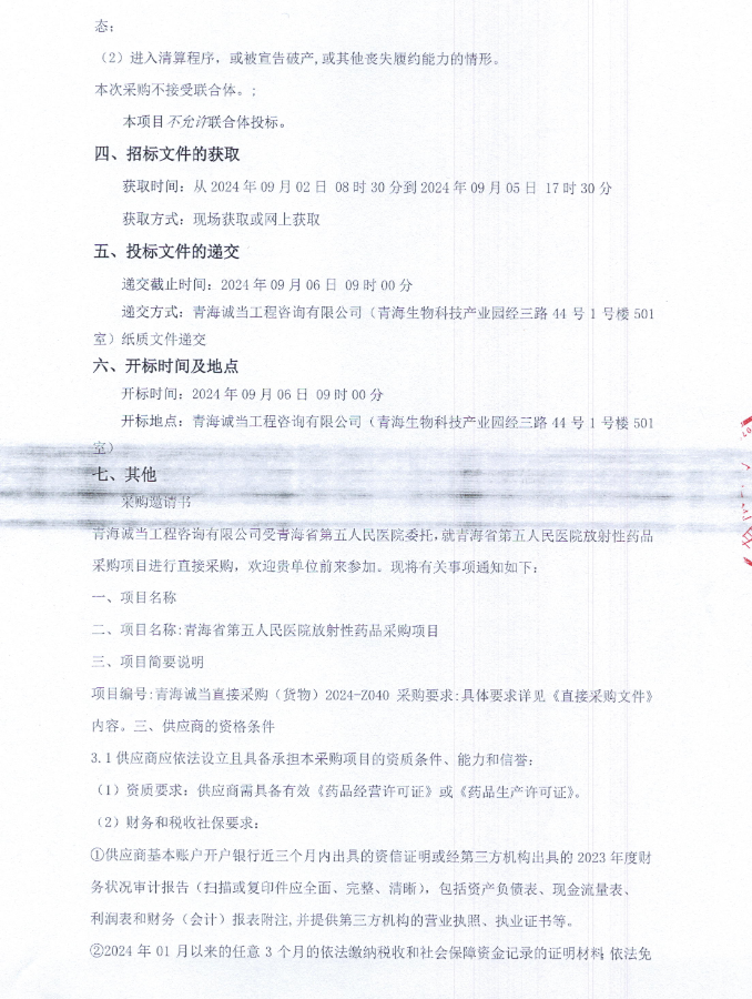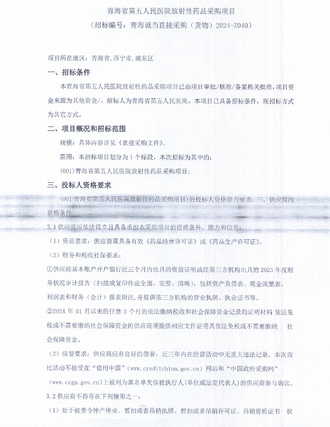 【青海省第五人民医院】青海省第五人民医院放射性药品采购项目