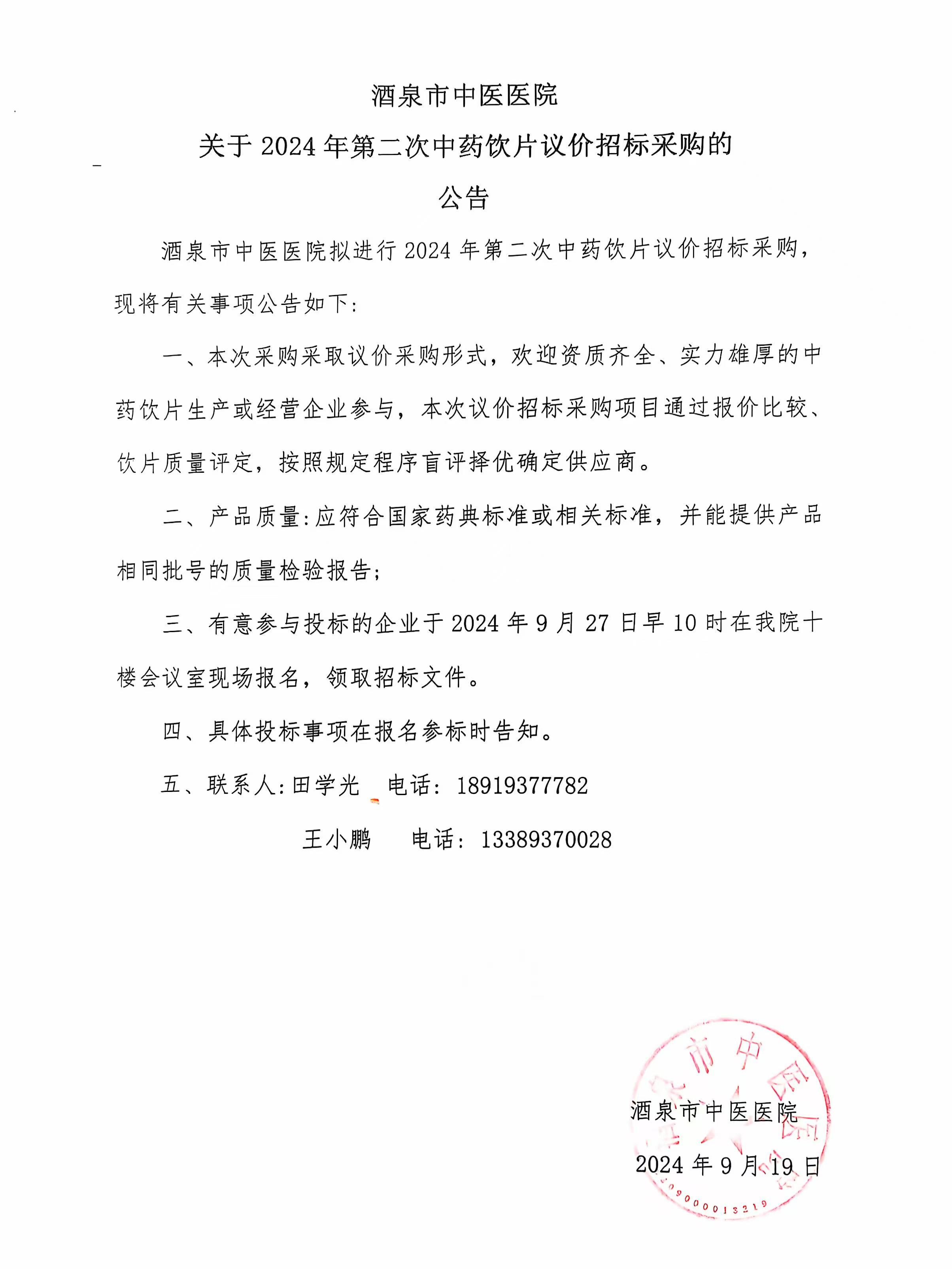 【酒泉市中医医院】甘肃省酒泉市中医医院关于2024年第二次中药饮片议价招标采购的公告