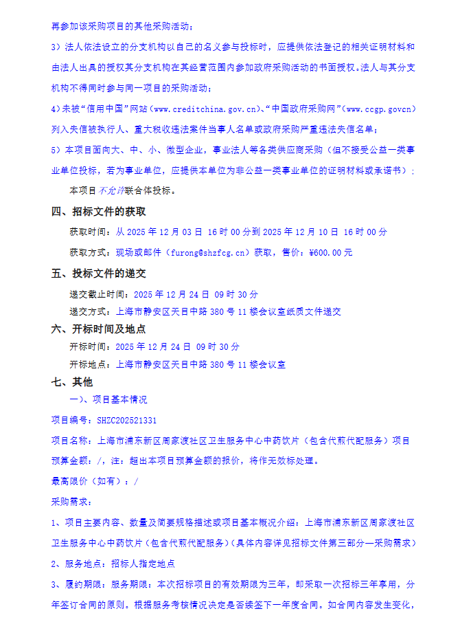 【上海市浦东新区周家渡社区卫生服务中心】上海市浦东新区周家渡社区卫生服务中心中药饮片(包含代煎代配服务)项目招标公告