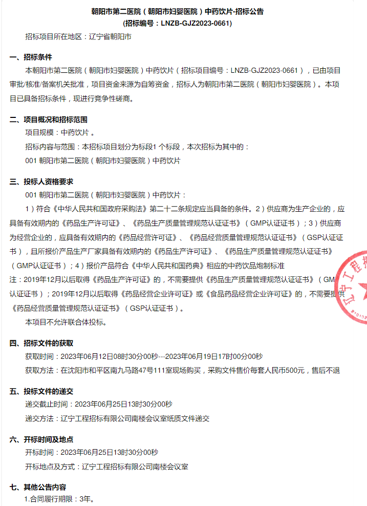 【朝阳市第二医院】辽宁省朝阳市第二医院(朝阳市妇婴医院)中药饮片-招标公告