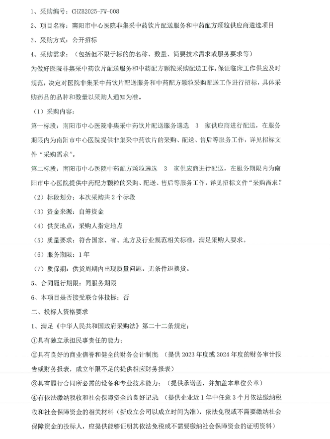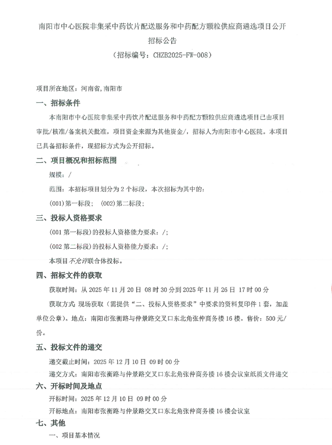 【南阳市中心医院】河南省南阳市中心医院非集采中药饮片配送服务和中药配方颗粒供应商遴选项目公开招标公告
