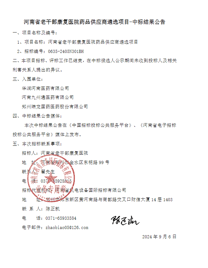 【河南省老干部康复医院】河南省老干部康复医院药品供应商遴选项目-中标结果公告
