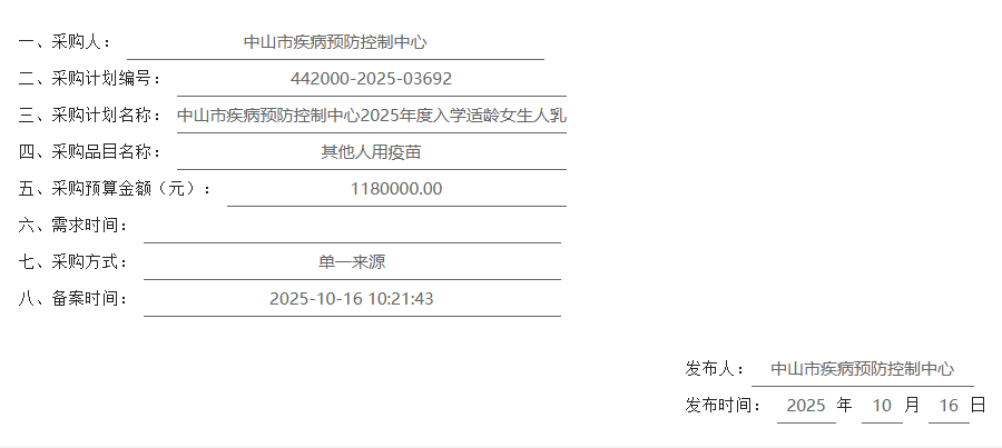 【中山市疾病预防控制中心】广东省中山市疾病预防控制中心2025年度入学适龄女生人乳头瘤(HPV)疫苗采购项目