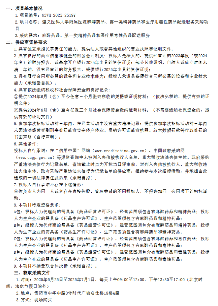 【遵义医科大学附属医院】贵州省遵义医科大学附属医院麻醉药品、第一类精神药品和医疗用毒性药品配送服务采购项目公开招标采购公告