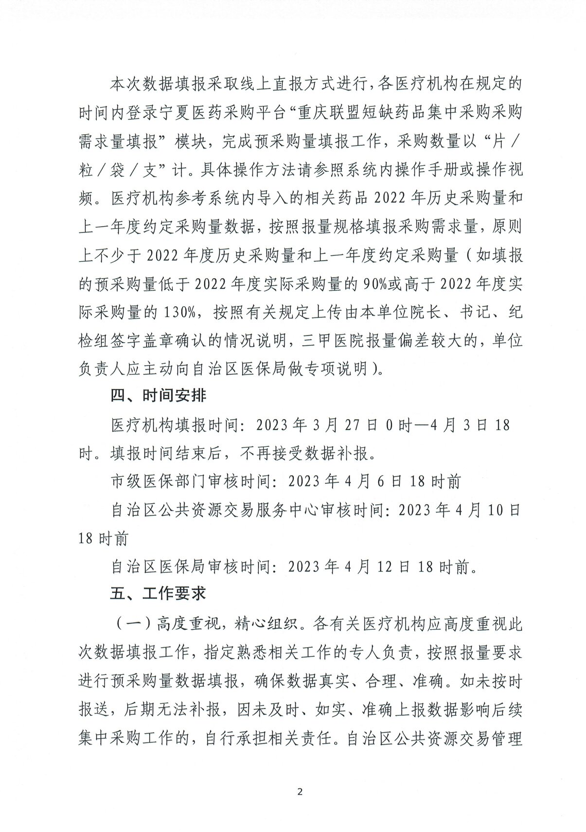(一)高度重视,精心组织。各有关医疗机构应高度重视此次数据填报工作,指定熟悉相关工作的专人负责,按照报量要求进行预采购量数据填报,确保数据真实、合理、准确。如未按时报送,后期无法补报,因未及时、如实、准确上报数据影响后续集中采购工作的,自行承担相关责任。自治区公共资源交易管理局和各级医保部门要提高政治站位,加强领导,精心组织辖区内医疗机构做好数据填报工作,督促医疗机构按实如期填报真实数据,确保本地区报量工作顺利开展。