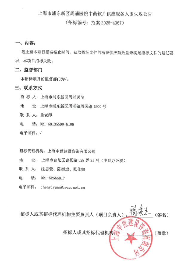 【上海市浦东新区周浦医院】上海市浦东新区周浦医院中药饮片供应服务入围失败公告