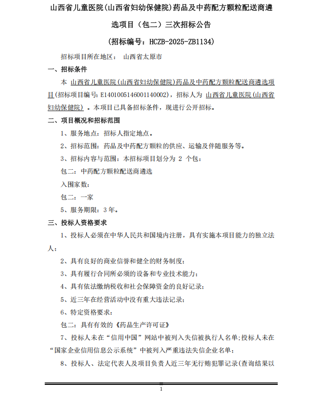 【山西省儿童医院】山西省儿童医院(山西省妇幼保健院)药品及中药配方颗粒配送商遴选项目(包二)三次招标公告