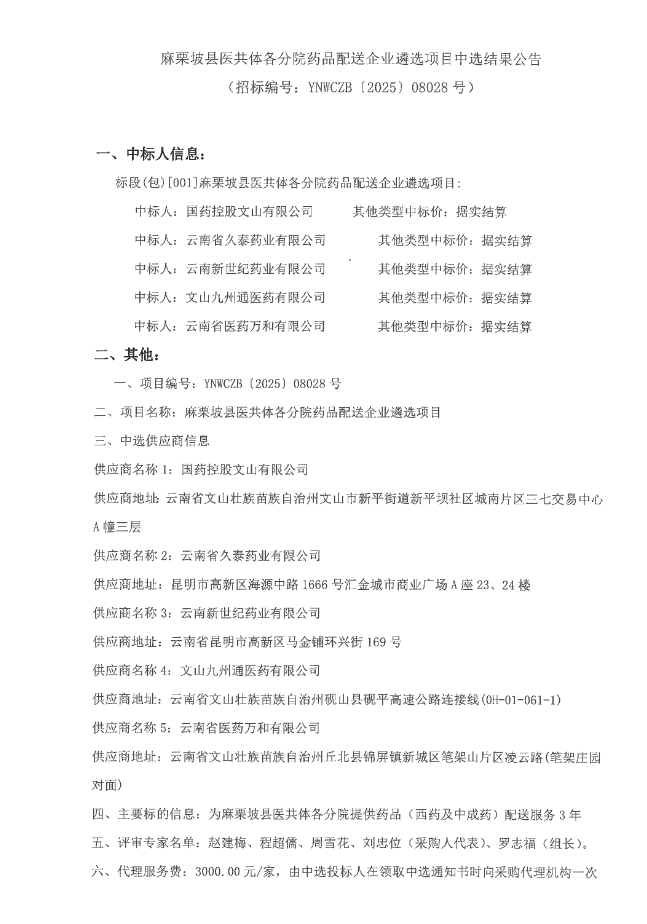 【文山壮族苗族自治州麻栗坡县人民医院】云南省文山壮族苗族自治州麻栗坡县医共体各分院药品配送企业遴选项目中选结果公告