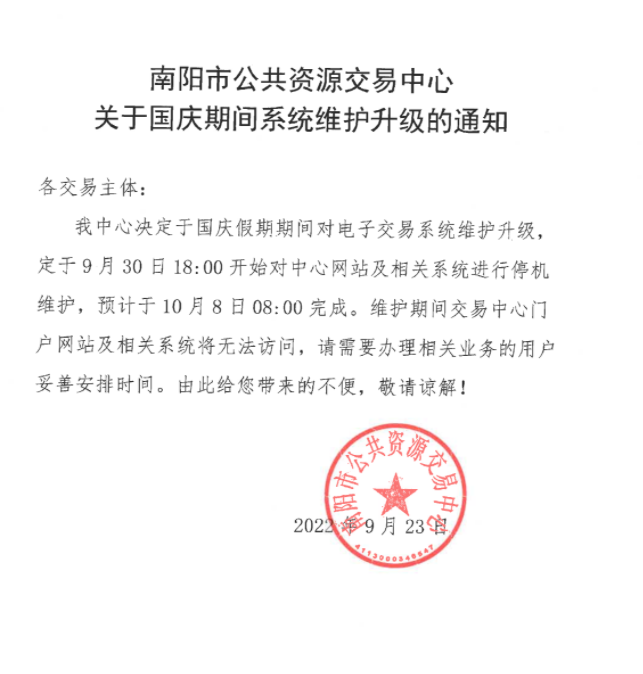 【南阳】河南省南阳市公共资源交易中心关于国庆期间系统维护升级的通知(20220923)