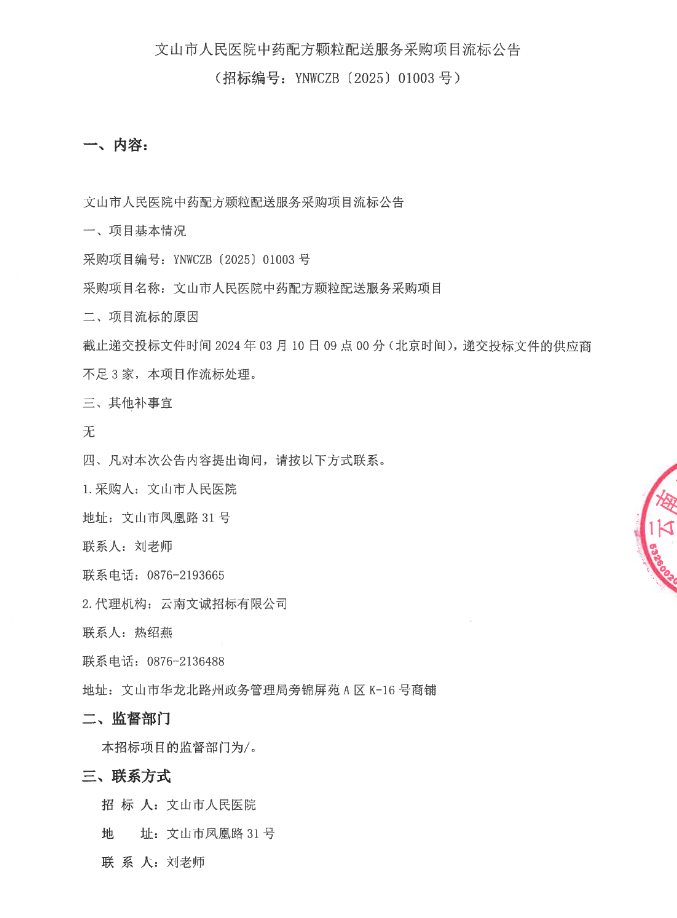 【文山壮族苗族自治州文山市人民医院】云南省文山壮族苗族自治州文山市人民医院中药配方颗粒配送服务采购项目流标公告