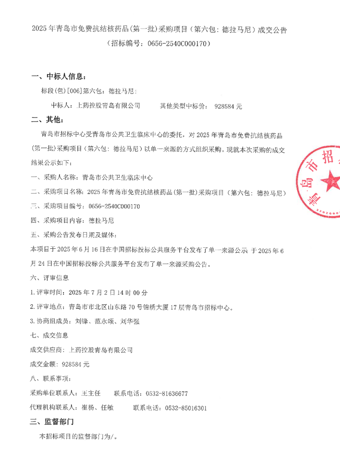 【青岛市公共卫生临床中心】山东省2025年青岛市免费抗结核药品(第一批)采购项目(第六包: 德拉马尼)成交公告