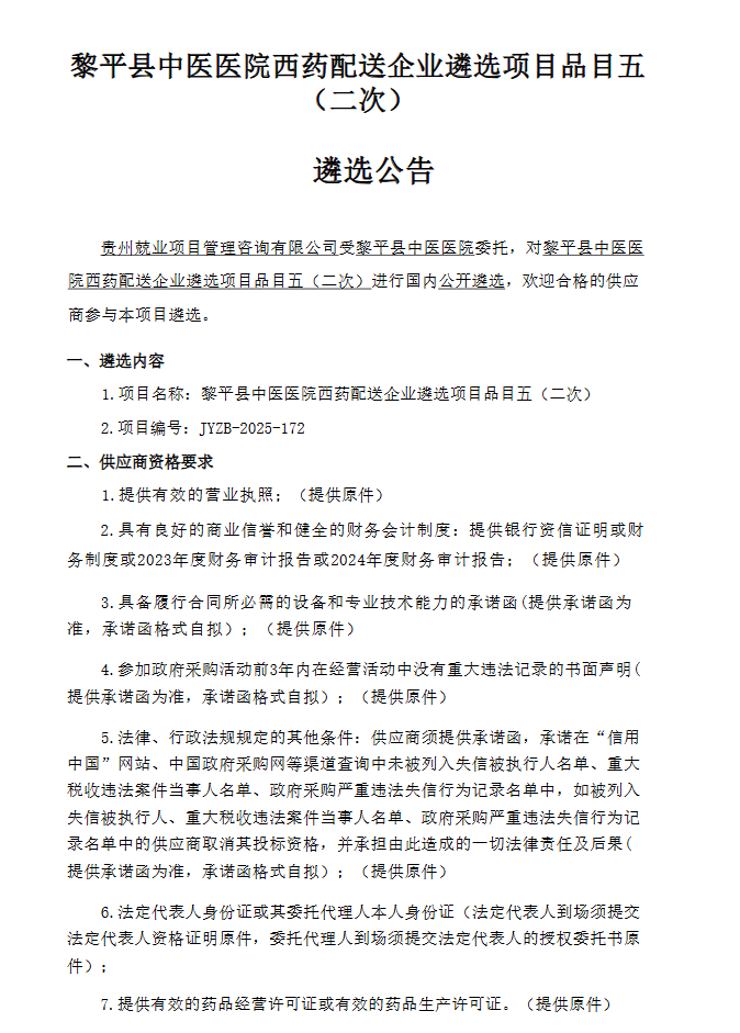 【黔东南苗族侗族自治州黎平县中医医院】贵州省黔东南苗族侗族自治州黎平县中医医院西药配送企业遴选项目品目五(二次)遴选公告