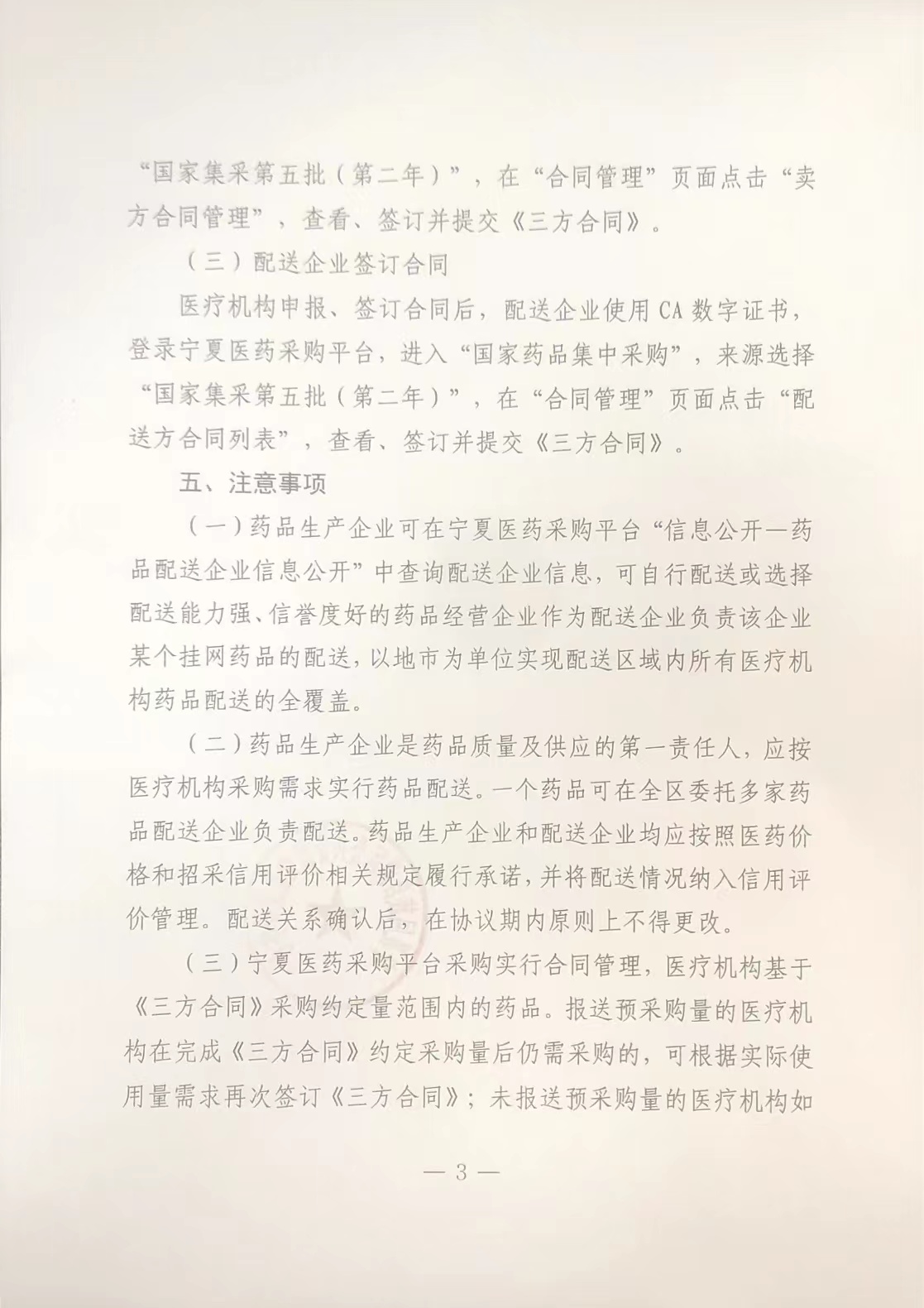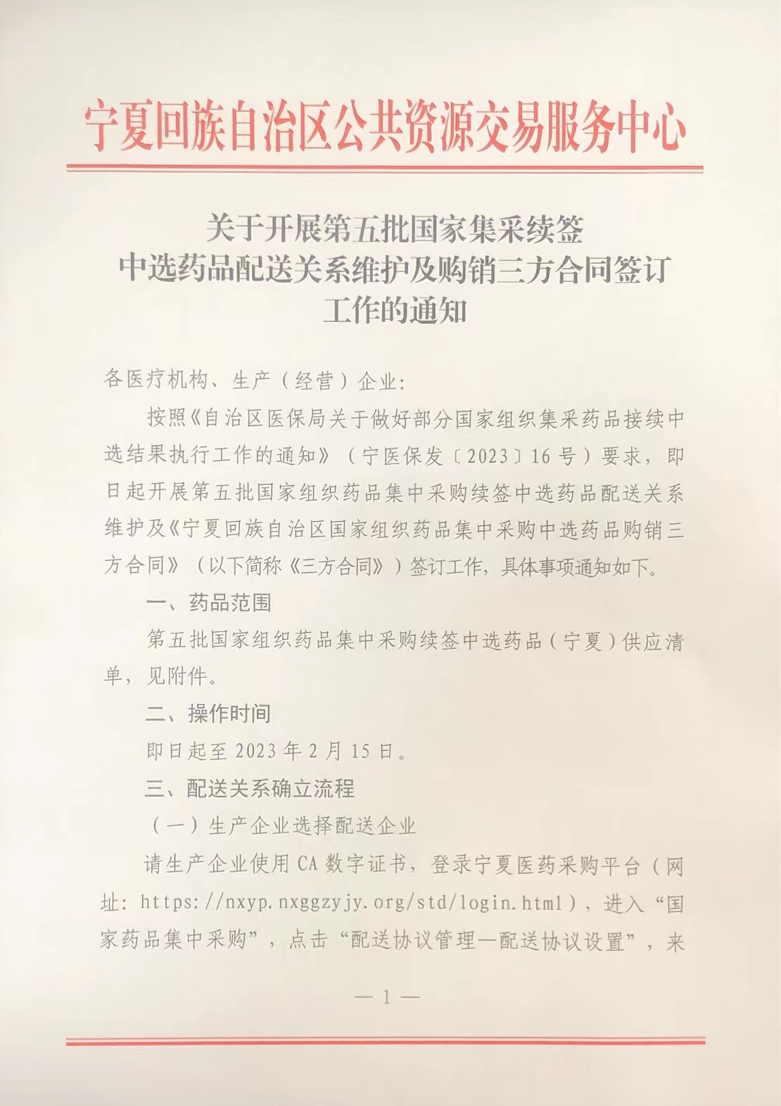 按照《自治区医保局关于做好部分国家组织集采药品接续中选结果执行工作的通知》(宁医保发〔2023〕16号)要求,即日起开展第五批国家组织药品集中采购续签中选药品配送关系维护及《宁夏回族自治区国家组织药品集中采购中选药品购销三方合同》(以下简称《三方合同》)签订工作,具体事项通知如下。
