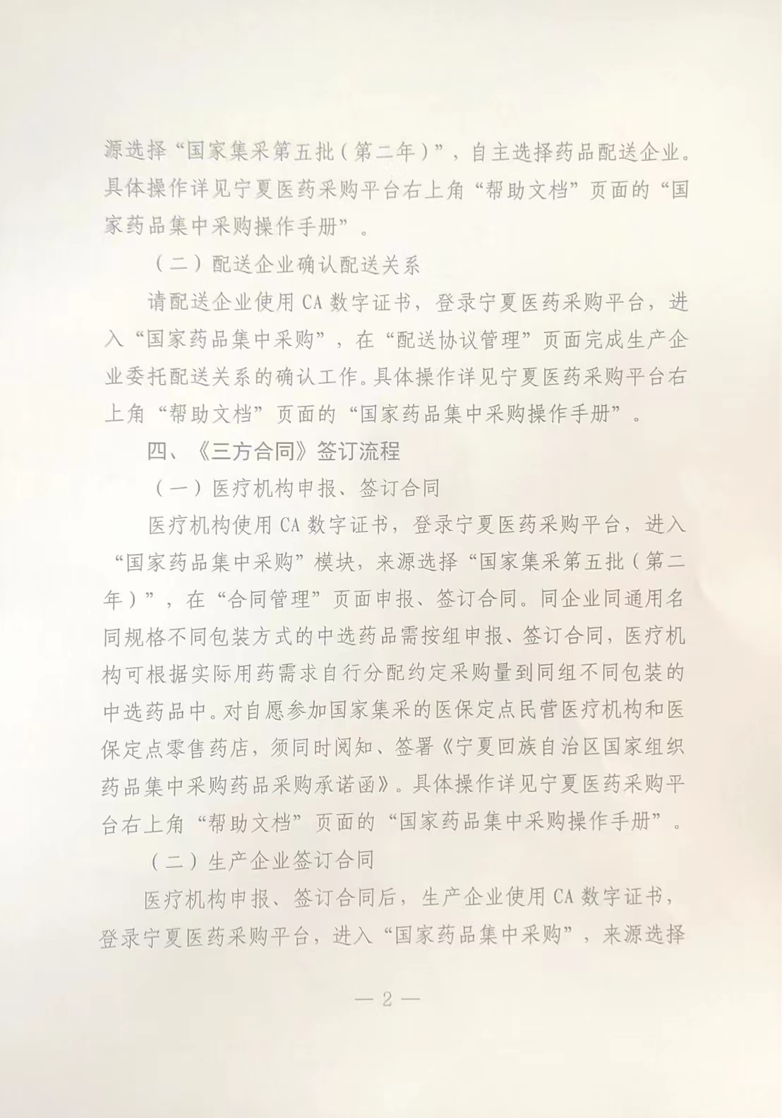 医疗机构申报、签订合同后,生产企业使用CA数字证书,登录宁夏医药采购平台,进入“国家药品集中采购”,来源选择“国家集采第五批(第二年)”,在“合同管理”页面点击“卖方合同管理”、查看、签订并提交《三方合同》。