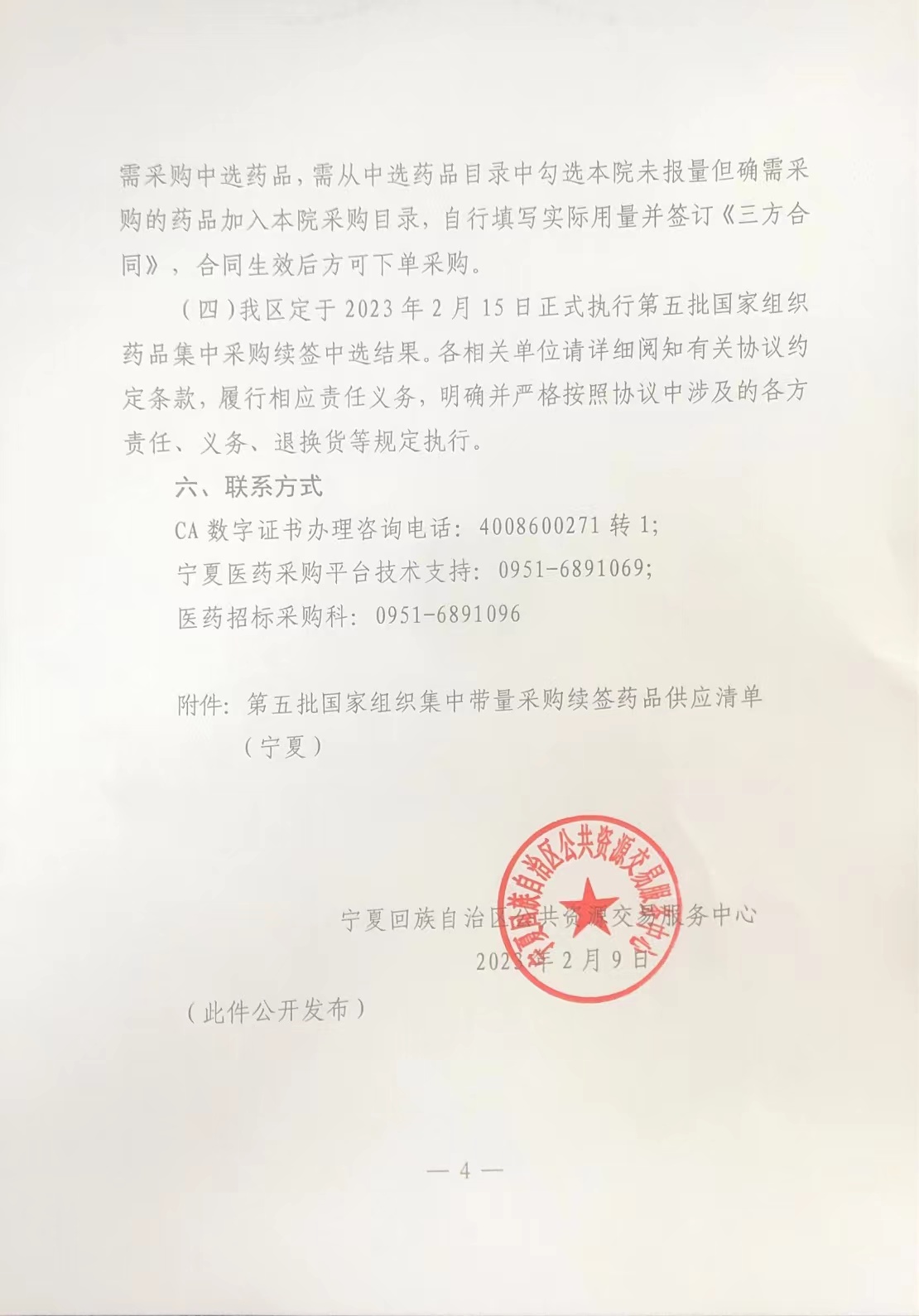 (四)我区定于2023年2月15日正式执行第五批国家组织药品集中采购续签中选结果。各相关单位请详细阅知有关协议约定条款,履行相应责任义务,明确并严格按照协议中涉及的各方责任、义务、退换货等规定执行。