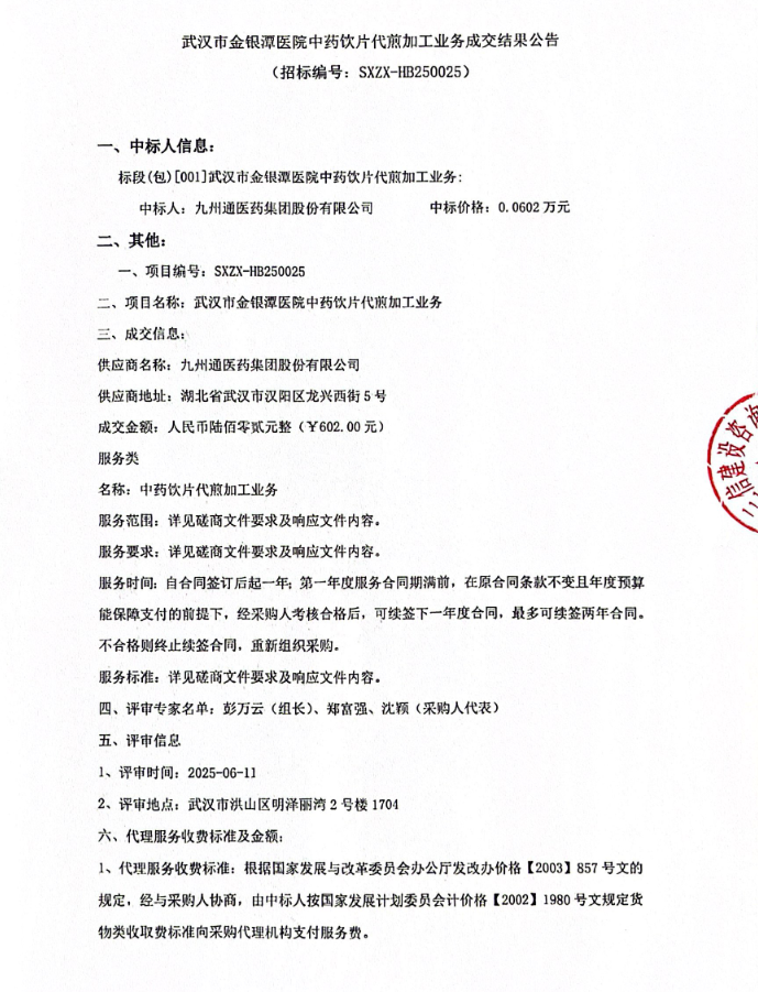 【武汉市金银潭医院】湖北省武汉市金银潭医院中药饮片代煎加工业务成交结果公告