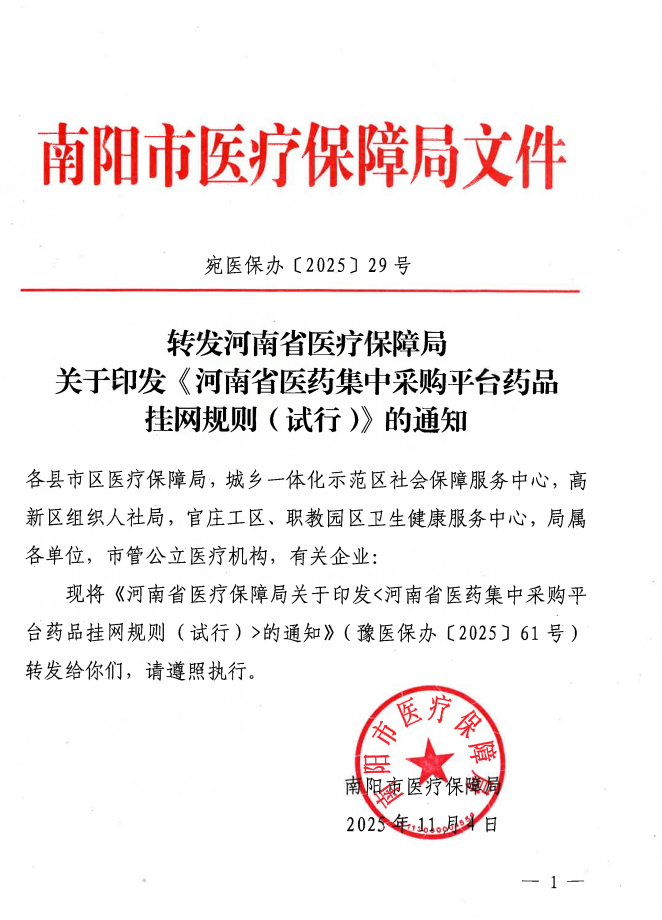 【南阳】宛医保办〔2025〕29号转发河南省医疗保障局关于印发《河南省医药集中采购平台药品挂网规则(试行)》的通知