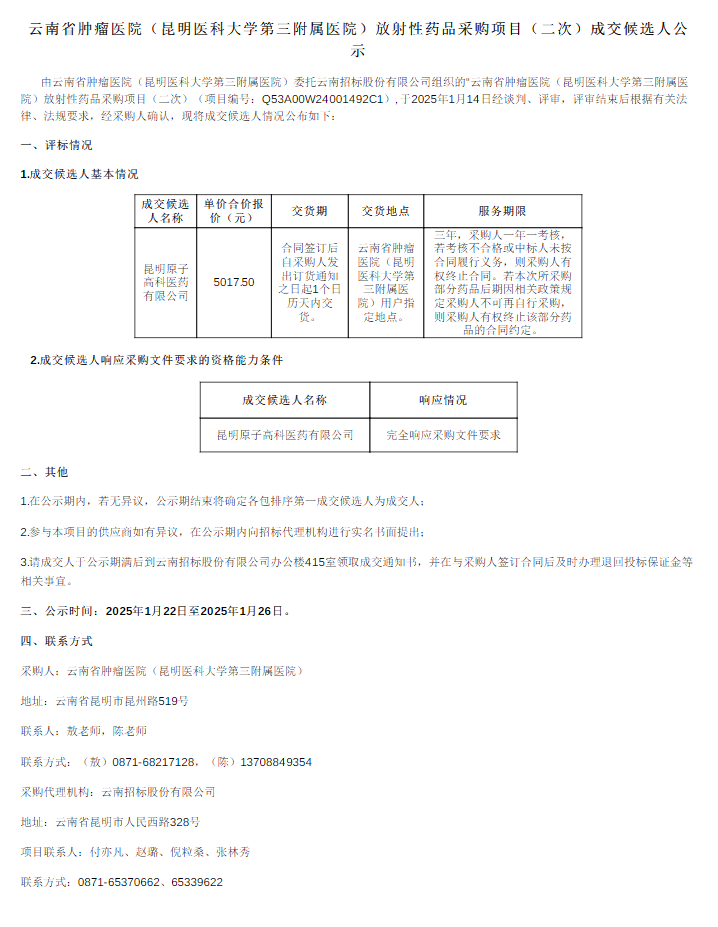【云南省肿瘤医院】云南省肿瘤医院(昆明医科大学第三附属医院)放射性药品采购项目(二次)成交候选人公示中标候选人公示