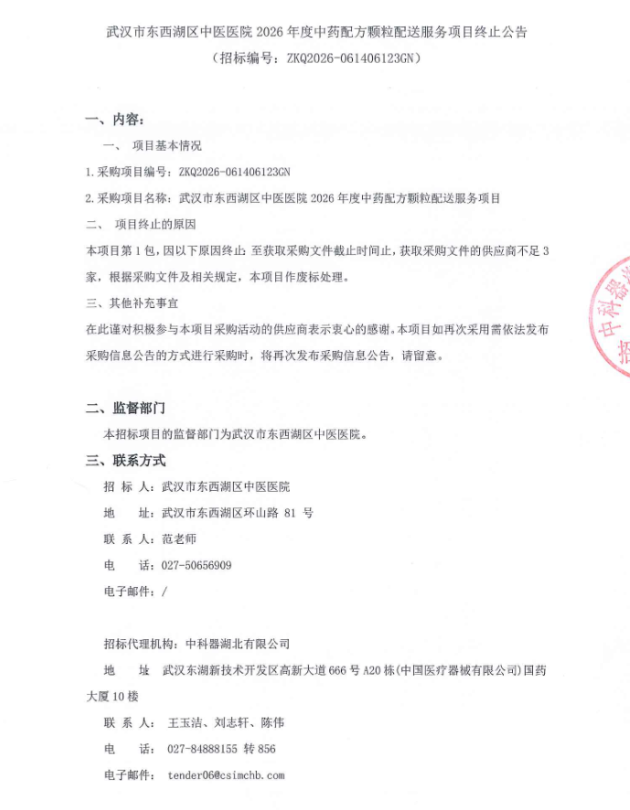【武汉市东西湖区中医医院】湖北省武汉市东西湖区中医医院2026年度中药配方颗粒配送服务项目终止公告