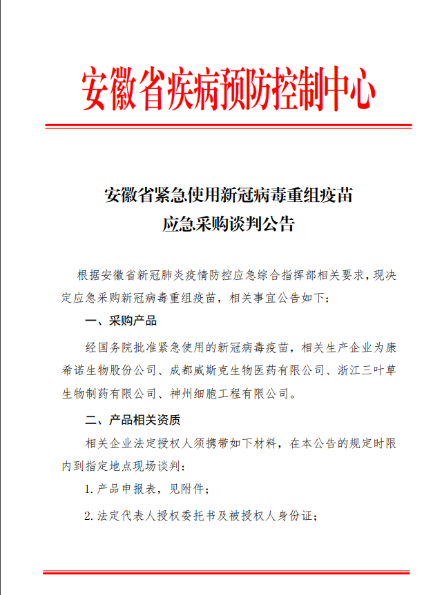根据安徽省新冠肺炎疫情防控应急综合指挥部相关要求,现决定应急采购新冠病毒重组疫苗,相关事宜公告如下: