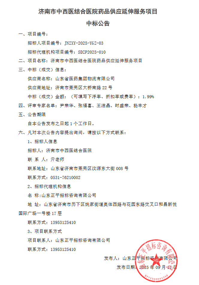 【济南市中西医结合医院】山东省济南市中西医结合医院药品供应延伸服务项目中标公告
