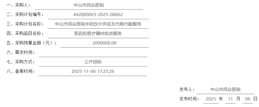 【中山市民众医院】广东省中山市民众医院中药饮片供应及代煎代配服务