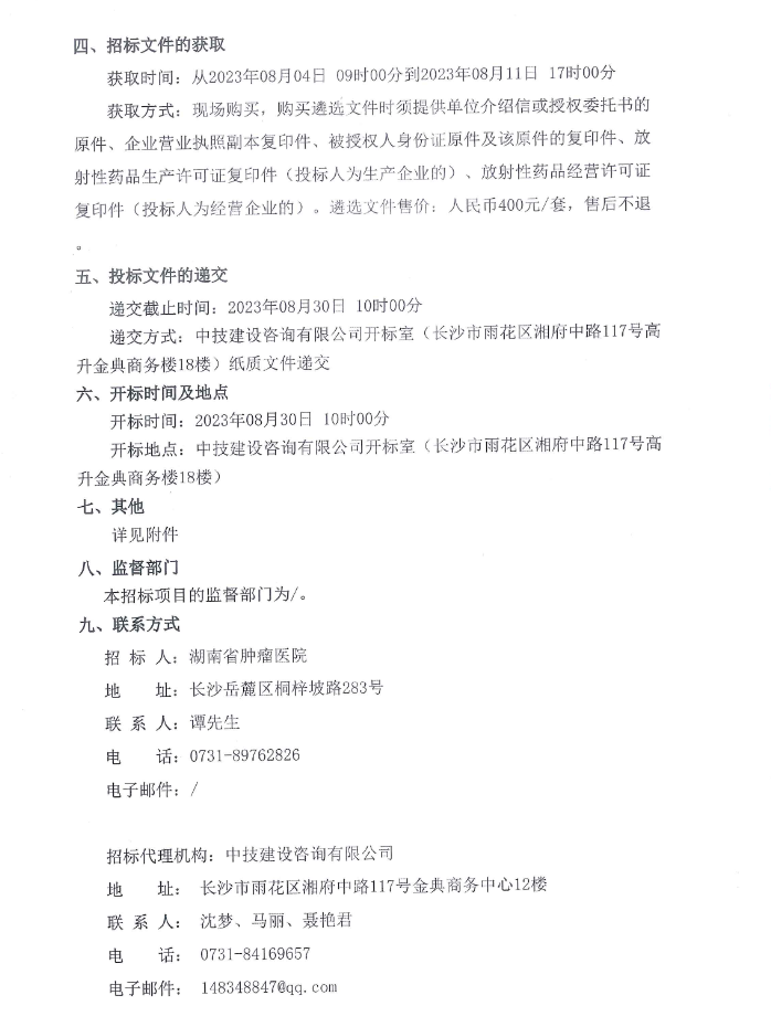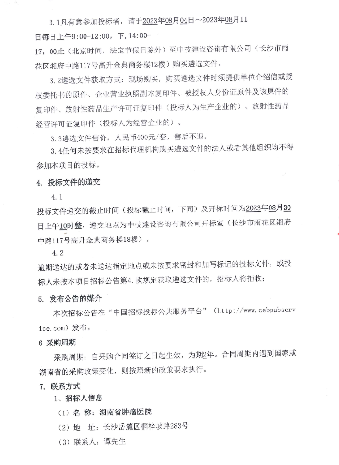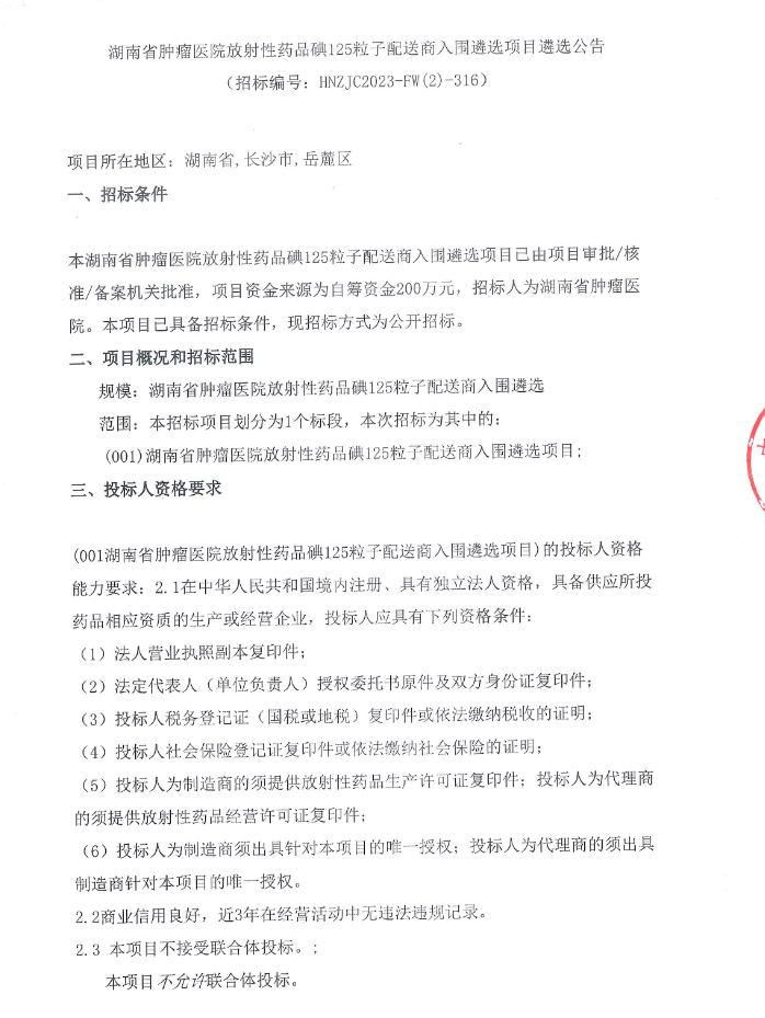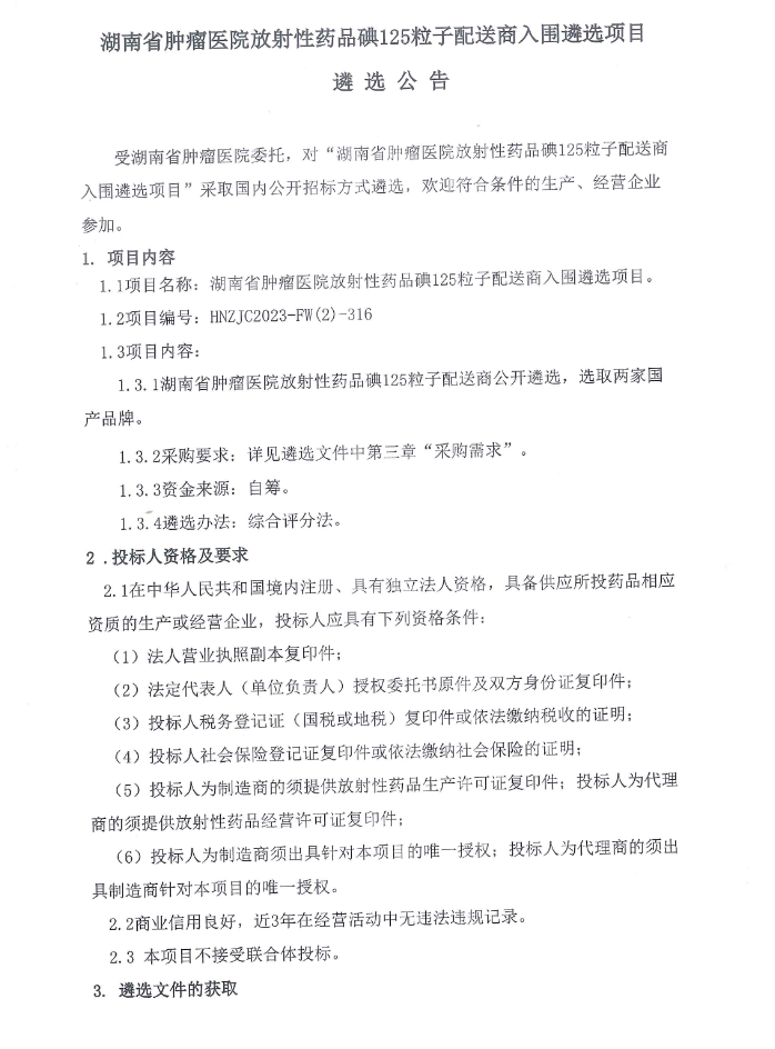 【湖南省肿瘤医院】湖南省肿瘤医院放射性药品碘125粒子配送商入围遴选项目遴选公告