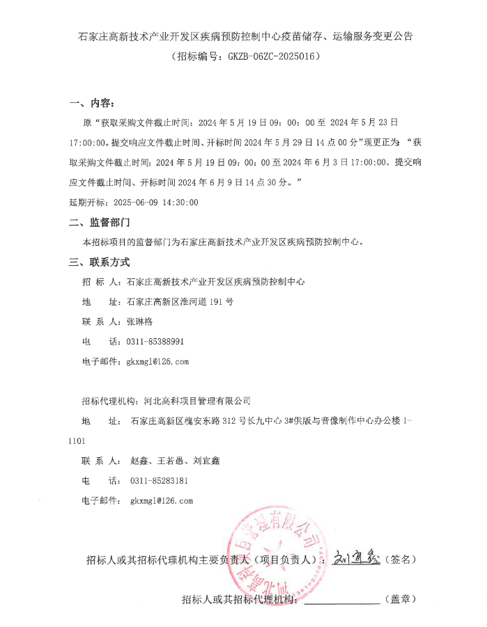 【石家庄高新技术产业开发区疾病预防控制中心】河北省石家庄高新技术产业开发区疾病预防控制中心疫苗储存、运输服务变更公告