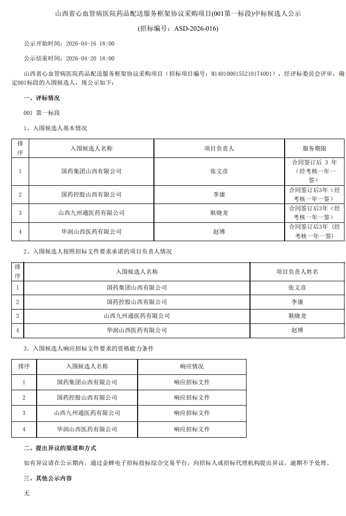 【山西省心血管病医院】山西省心血管病医院药品配送服务框架协议采购项目(001第一标段)中标候选人公示