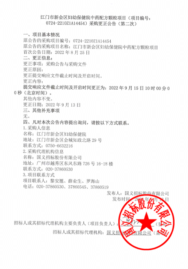 【广东省江门市新会区妇幼保健院】中药配方颗粒项目(项目编号:0724-2210Z1A14454)采购更正公告(第二次)