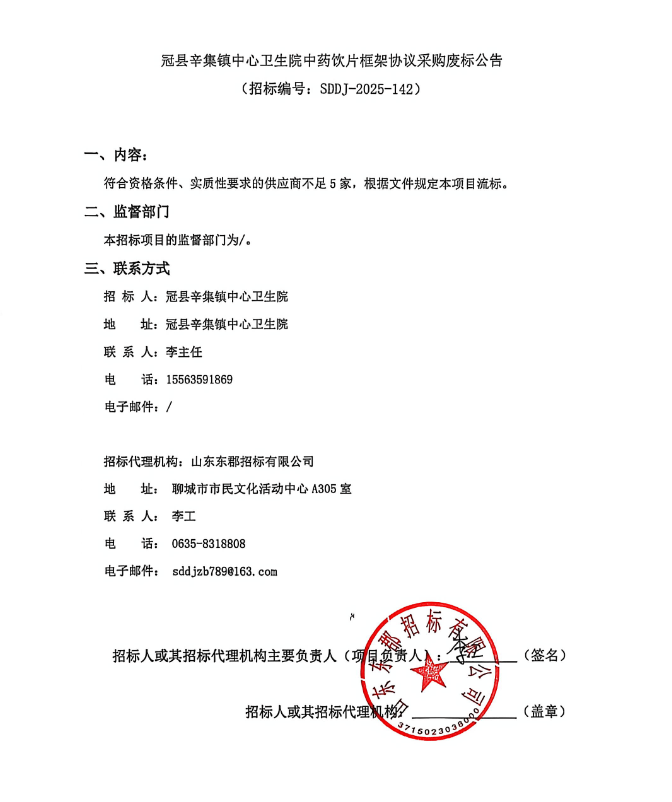 【聊城市冠县辛集镇中心卫生院】山东省聊城市冠县辛集镇中心卫生院中药饮片框架协议采购废标公告