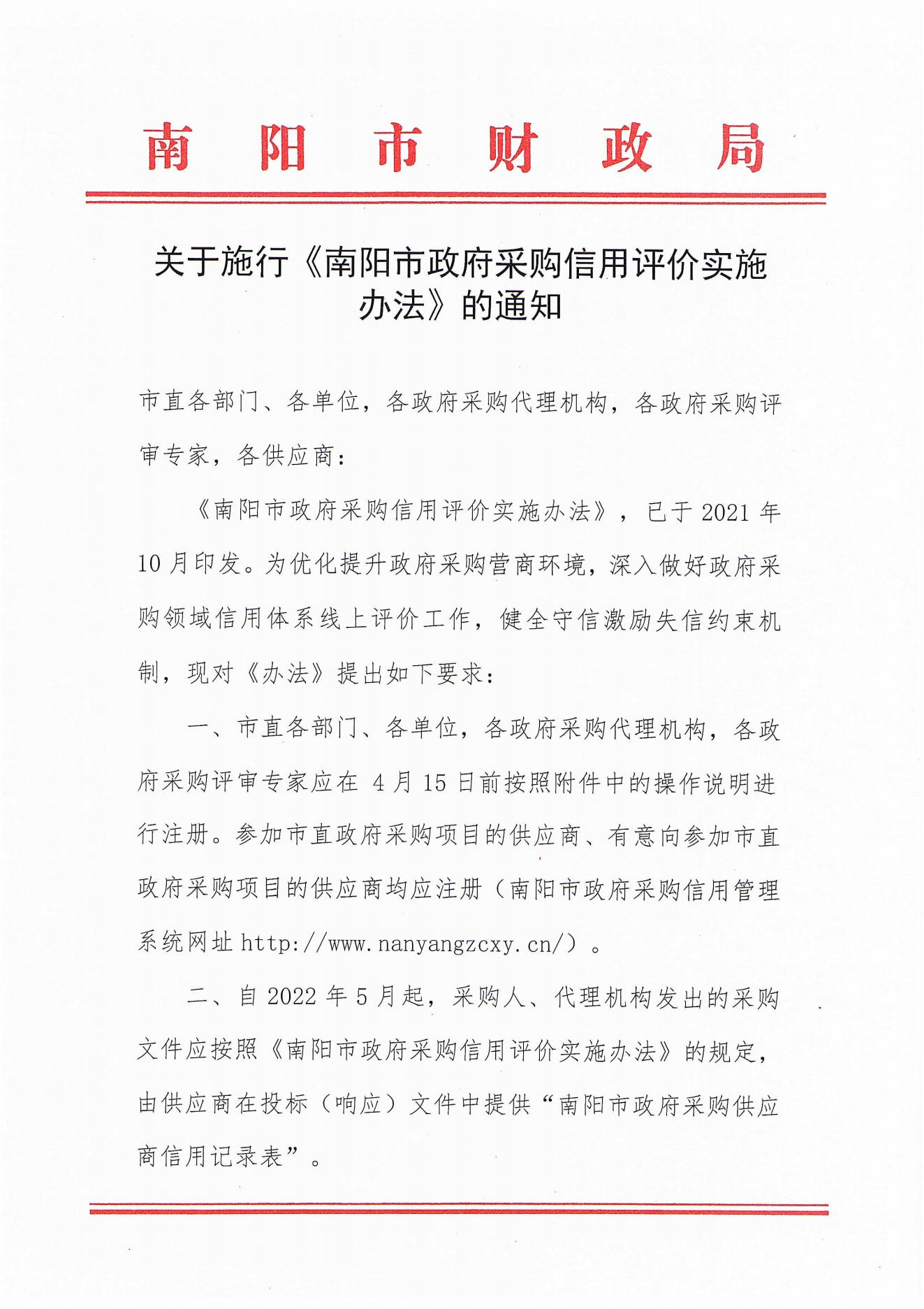 【南阳】河南省南阳市关于施行《南阳市政府采购信用评价实施办法》的通知
