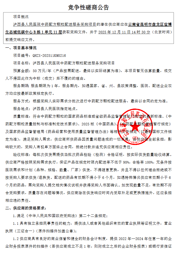 【红河哈尼族彝族自治州泸西县人民医院】云南省红河哈尼族彝族自治州泸西县人民医院中药配方颗粒配送服务采购项目