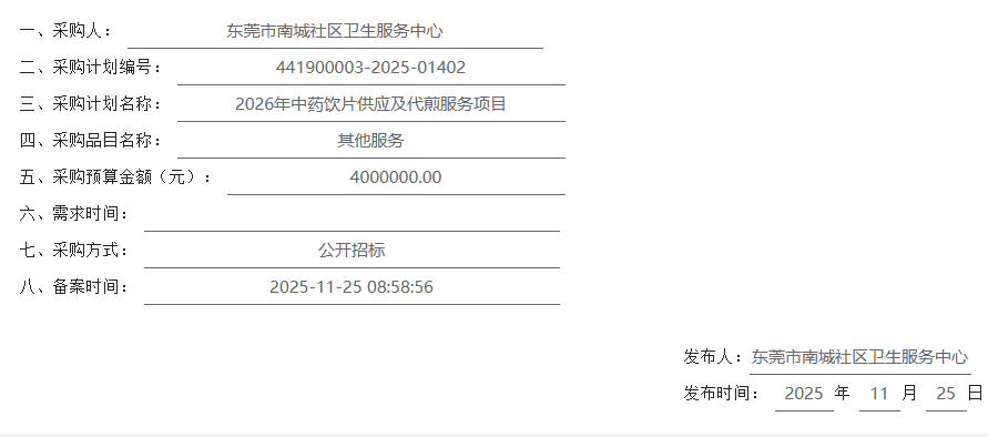 【东莞市南城社区卫生服务中心】广东省东莞市南城社区卫生服务中心2026年中药饮片供应及代煎服务项目