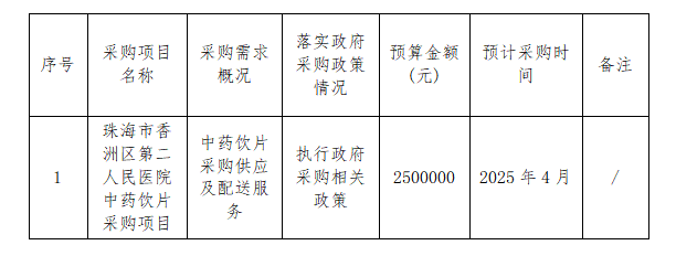 【珠海市香洲区第二人民医院】广东省珠海市香洲区第二人民医院中药饮片采购项目意向公开