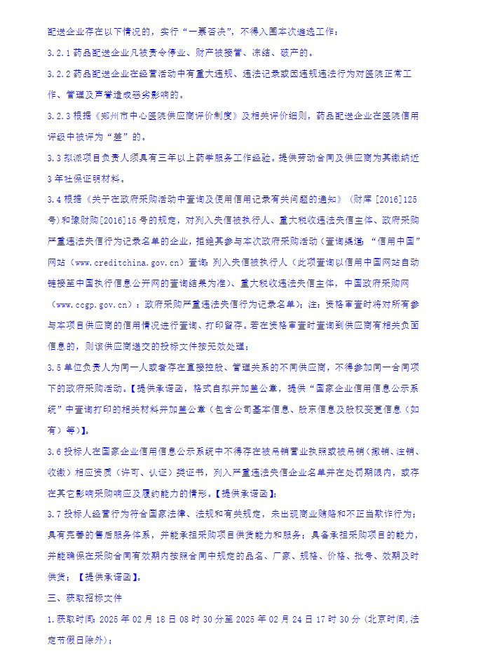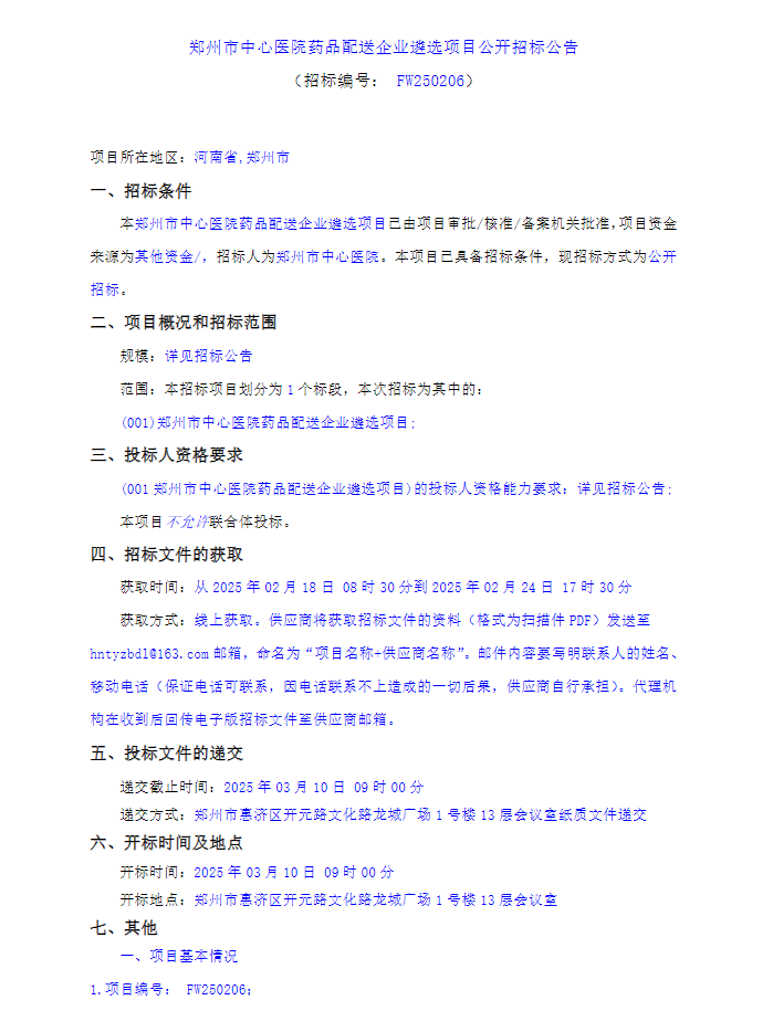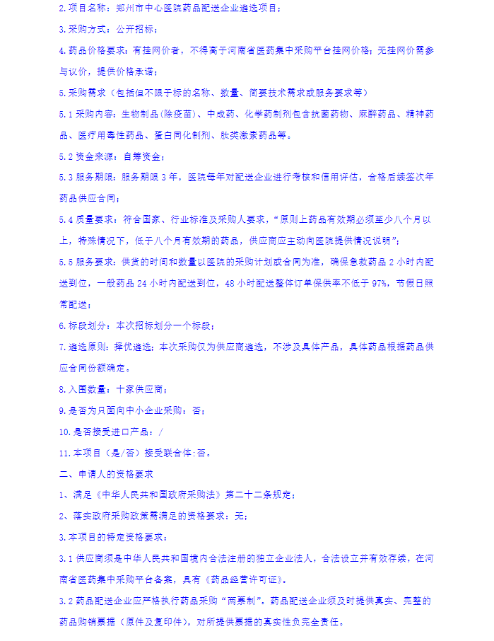 【郑州市中心医院】河南省郑州市中心医院药品配送企业遴选项目公开招标公告