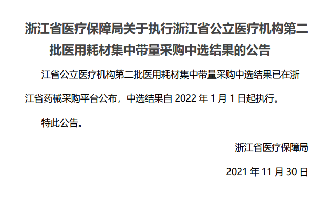 【宁波】浙江省医疗保障局关于执行浙江省公立医疗机构第二批医用耗材集中带量采购中选结果的公告