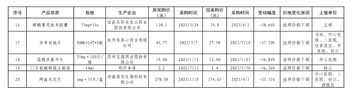 【宜昌】2023年第二季度药品价格监测表(降幅前20)