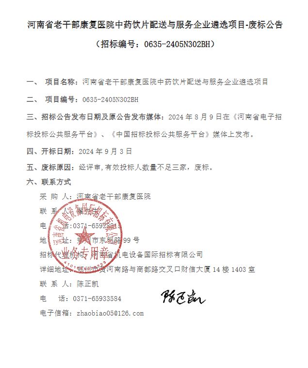 【河南省老干部康复医院】河南省老干部康复医院中药饮片配送与服务企业遴选项目-废标公告