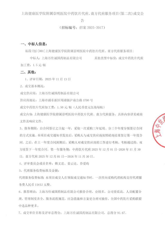 【上海健康医学院附属崇明医院】上海健康医学院附属崇明医院中药饮片代煎、膏方代煎服务项目(第二次)成交公告