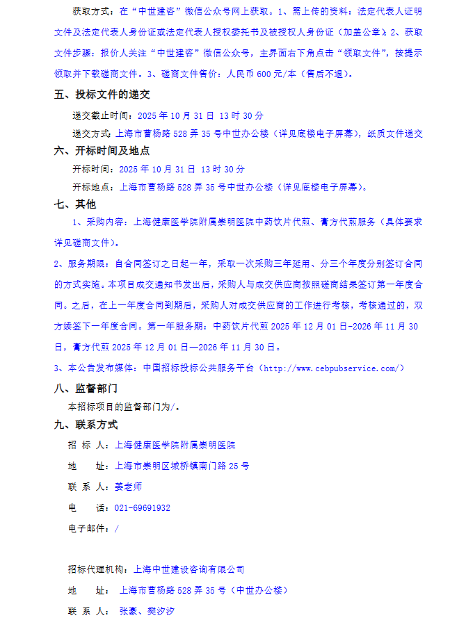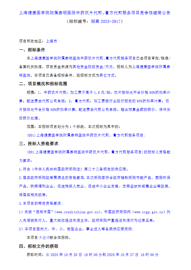 【上海健康医学院附属崇明医院】上海健康医学院附属崇明医院中药饮片代煎、膏方代煎服务项目竞争性磋商公告