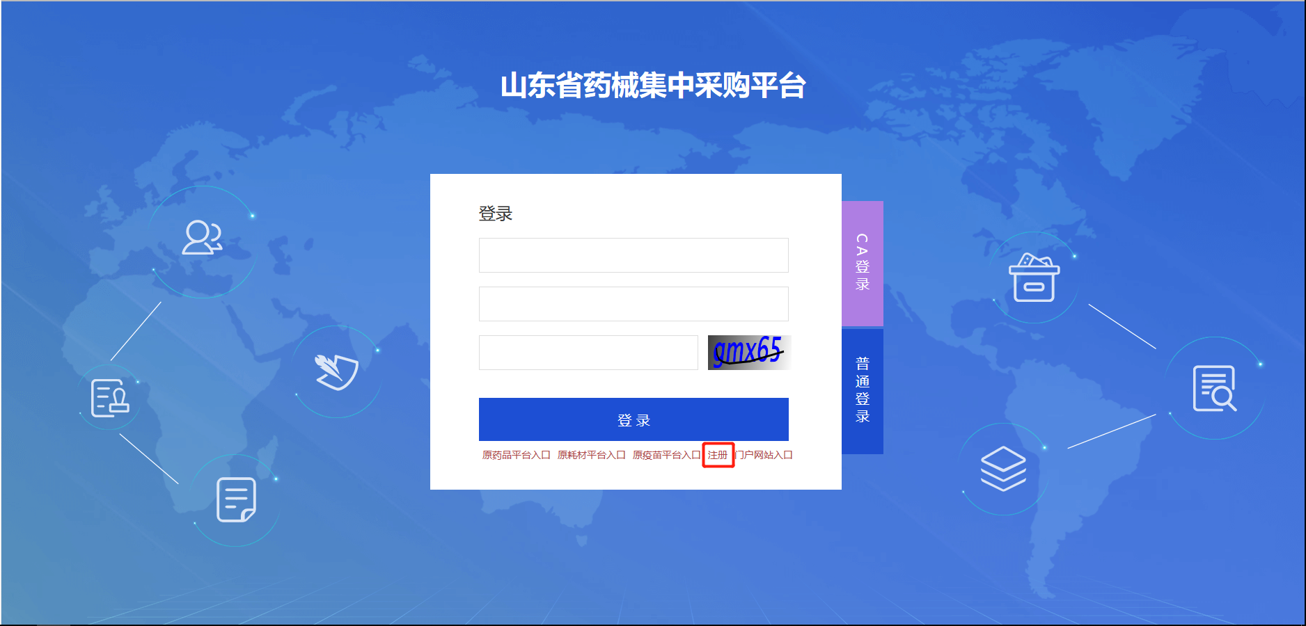 登录“山东省药械集中采购平台(http://ggzyjyzx.shandong.gov.cn/yxpt)”,选择“普通登录”-点击“注册”-选择“医疗机构注册(药品)”-机构类型选择“药店”,填报相关信息,点击“提交”完成注册。