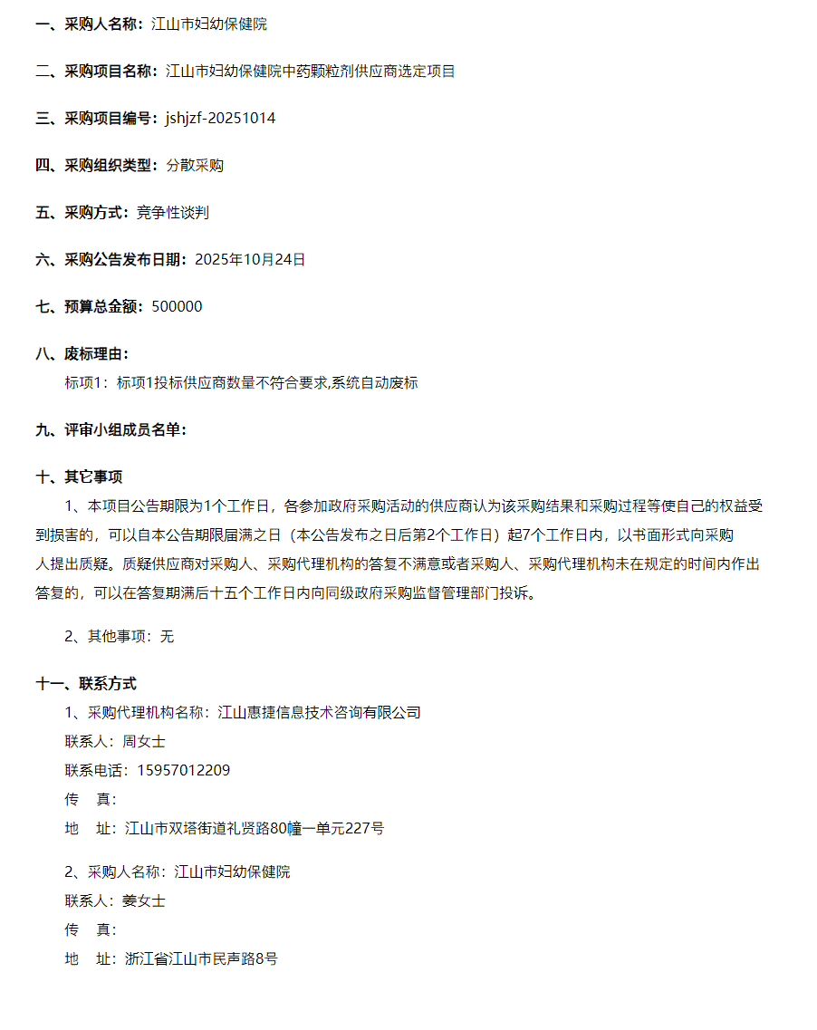 【衢州市江山市妇幼保健院】浙江省关于江山市妇幼保健院中药颗粒剂供应商选定项目废标公告