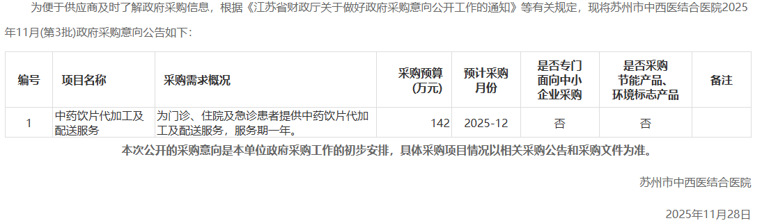 【苏州市中西医结合医院】江苏省苏州市中西医结合医院2025年11月(第3批)政府采购意向公告